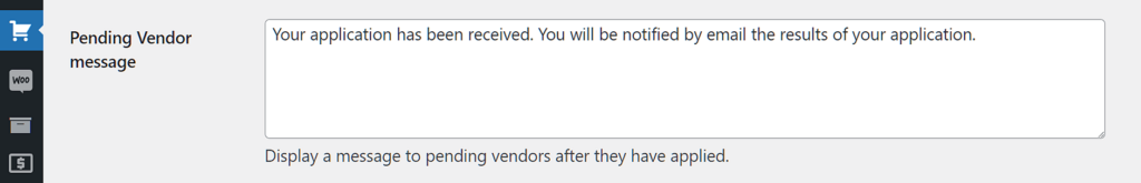 This is the message that the system displays to applicants after their submission of the vendor signup form. Applicants will see your message on their My Account page while they’re waiting for you to approve them joining your marketplace.