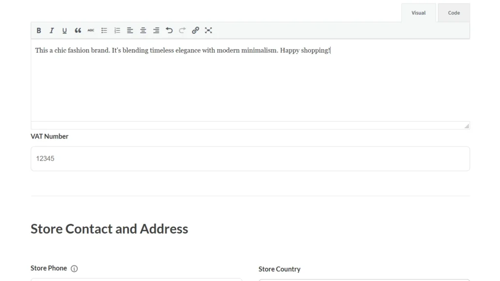 Once saved, vendors will see this field in their Vendor Dashboard at Settings → Store under the Store Description, allowing them to input and update their VAT information at any time.