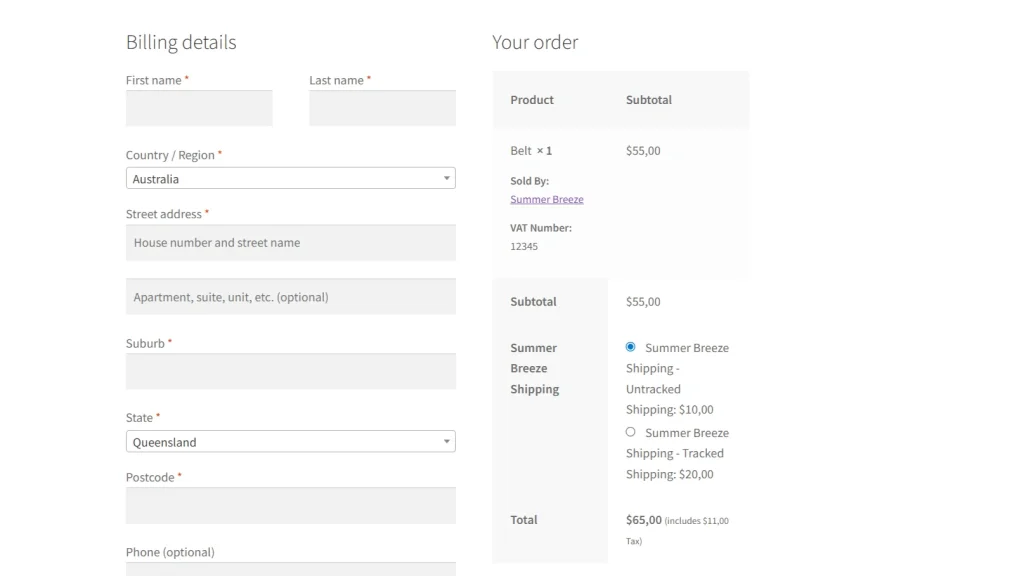 Checkout Page: If the “Show on Checkout” option is enabled, the vendor’s VAT number will be displayed during the final payment steps, ensuring all necessary tax information is visible before the order is placed.