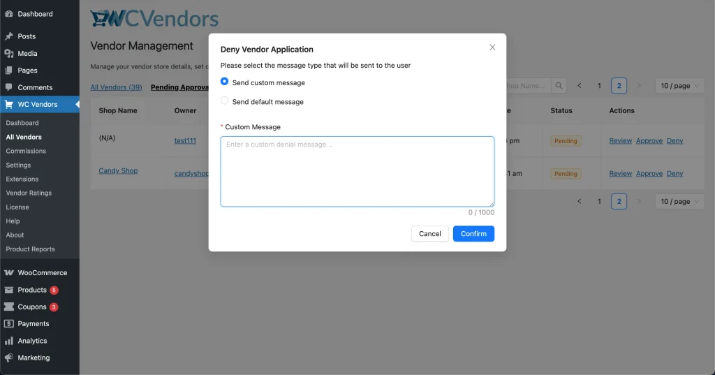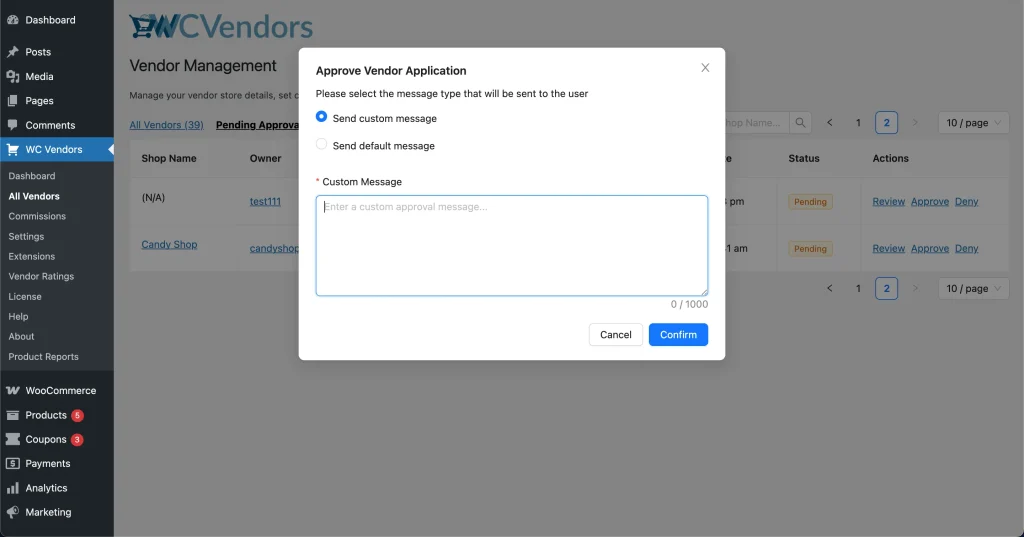 If you need to modify the default message templates, you can edit the vendor approval and denial email templates provided by WC Vendors.