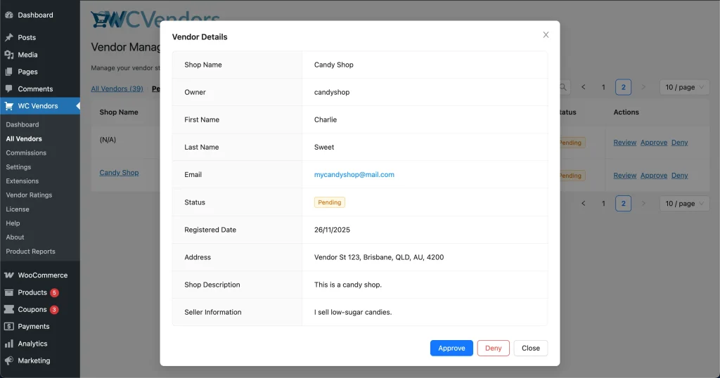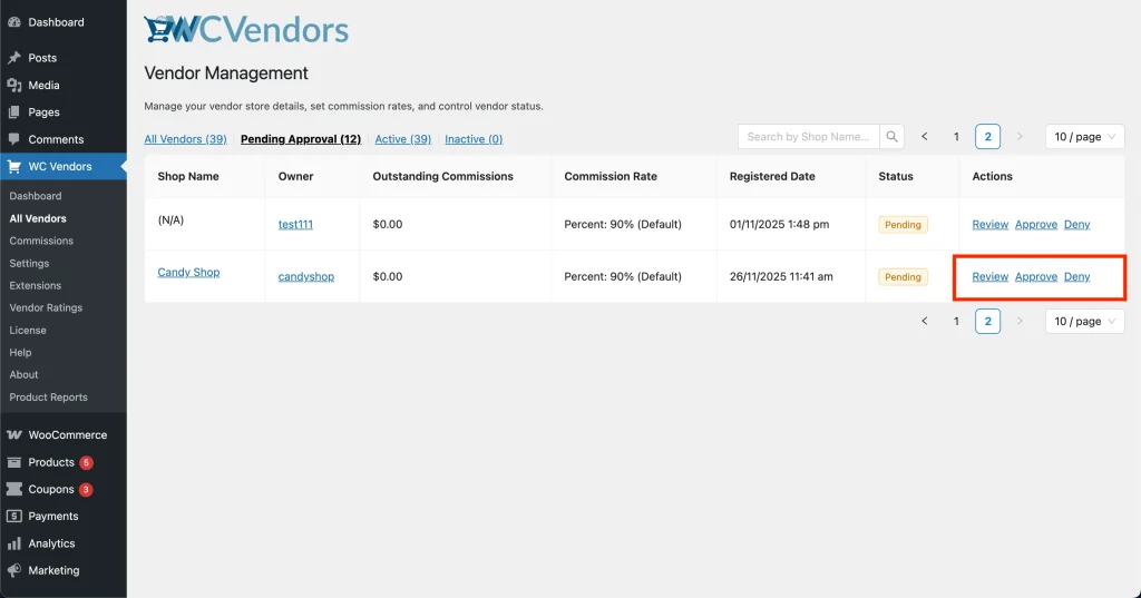 1. Go to WP Dashboard → WC Vendors → All Vendors → Pending Approval