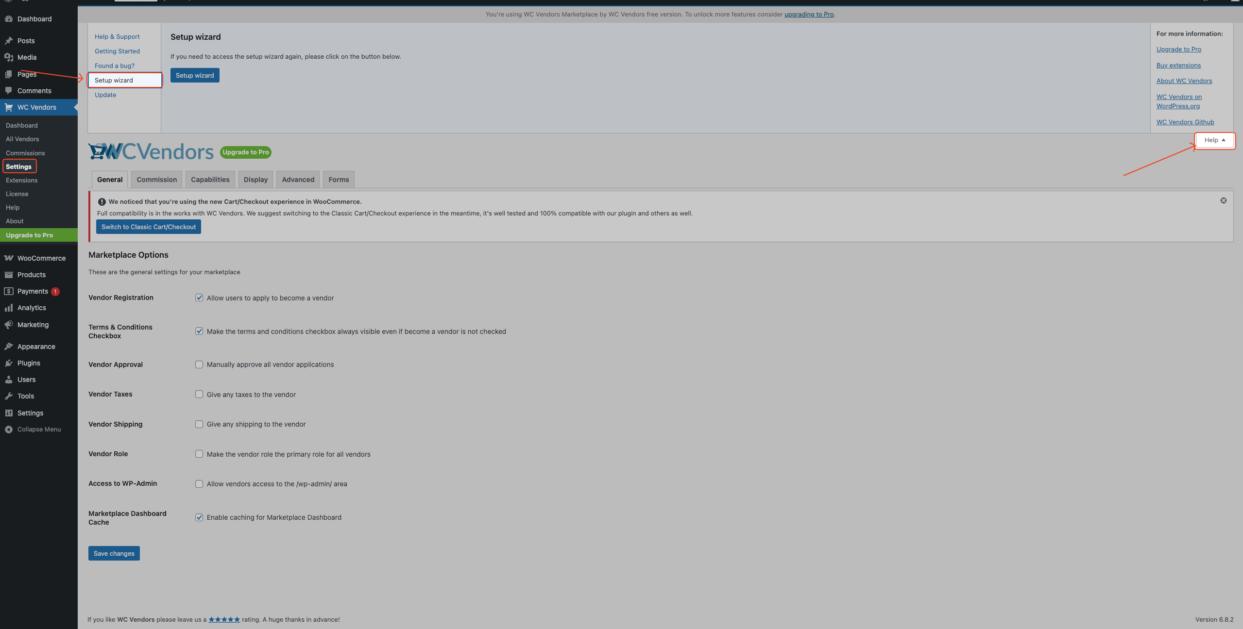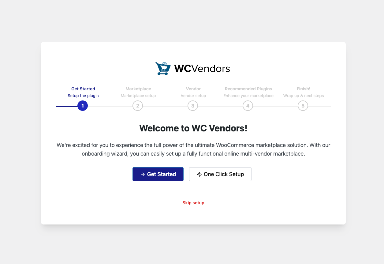 After installing and activating WC Vendors Marketplace, you’ll be prompted to run the Setup Wizard. This wizard helps you quickly configure your marketplace with the basic settings you need to get started.
