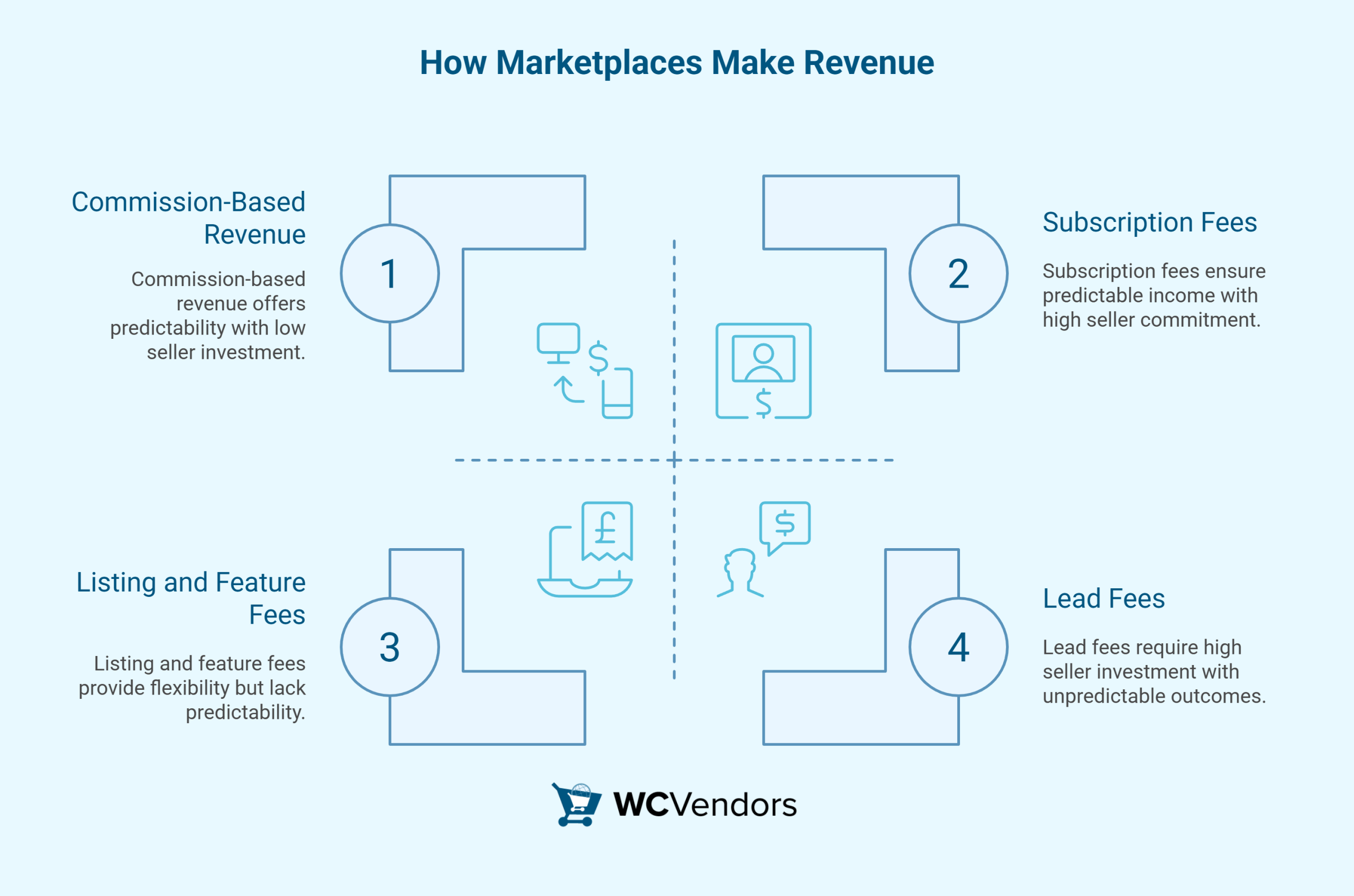 Infographic showing how marketplaces make revenue through commission-based revenue, subscription fees, listing and feature fees, and lead fees