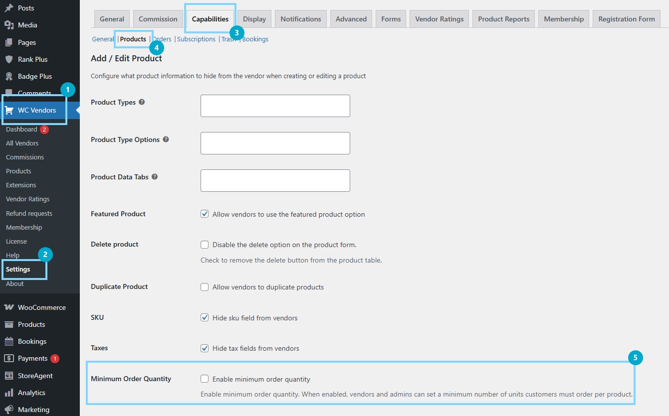 - Navigate to WC Vendors > Settings > Capabilities > Products