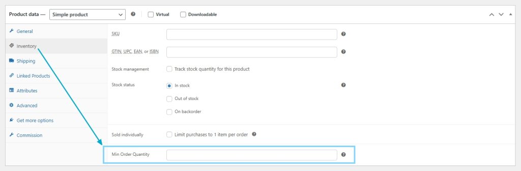 Vendors can set minimum order quantity values directly from their product dashboard. The MOQ field appears in the Inventory tab, positioned logically below the Stock Status field.
