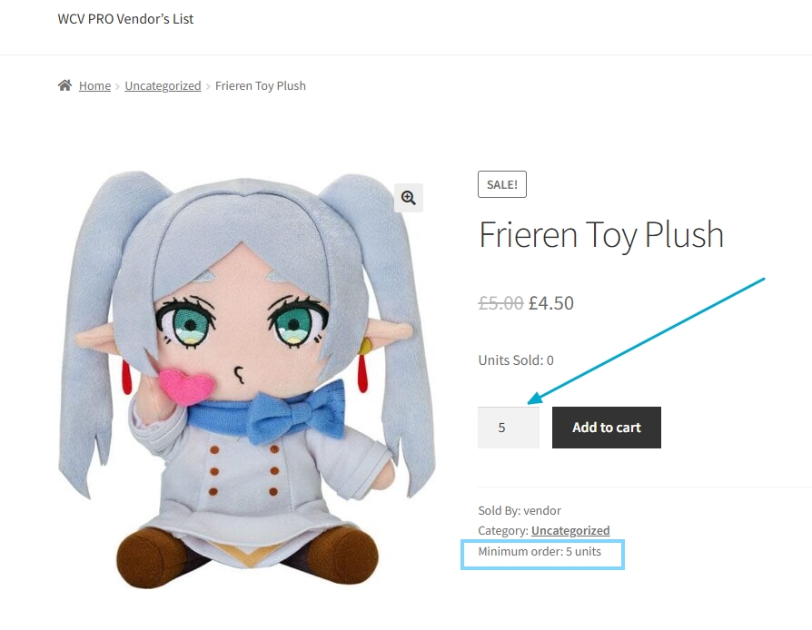 The quantity input field also respects the minimum. If a vendor sets an MOQ of 5, the quantity selector won’t allow values below 5. Customers understand immediately what’s required.