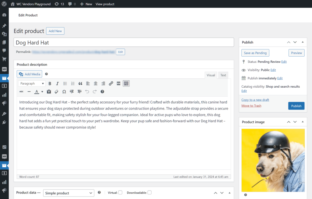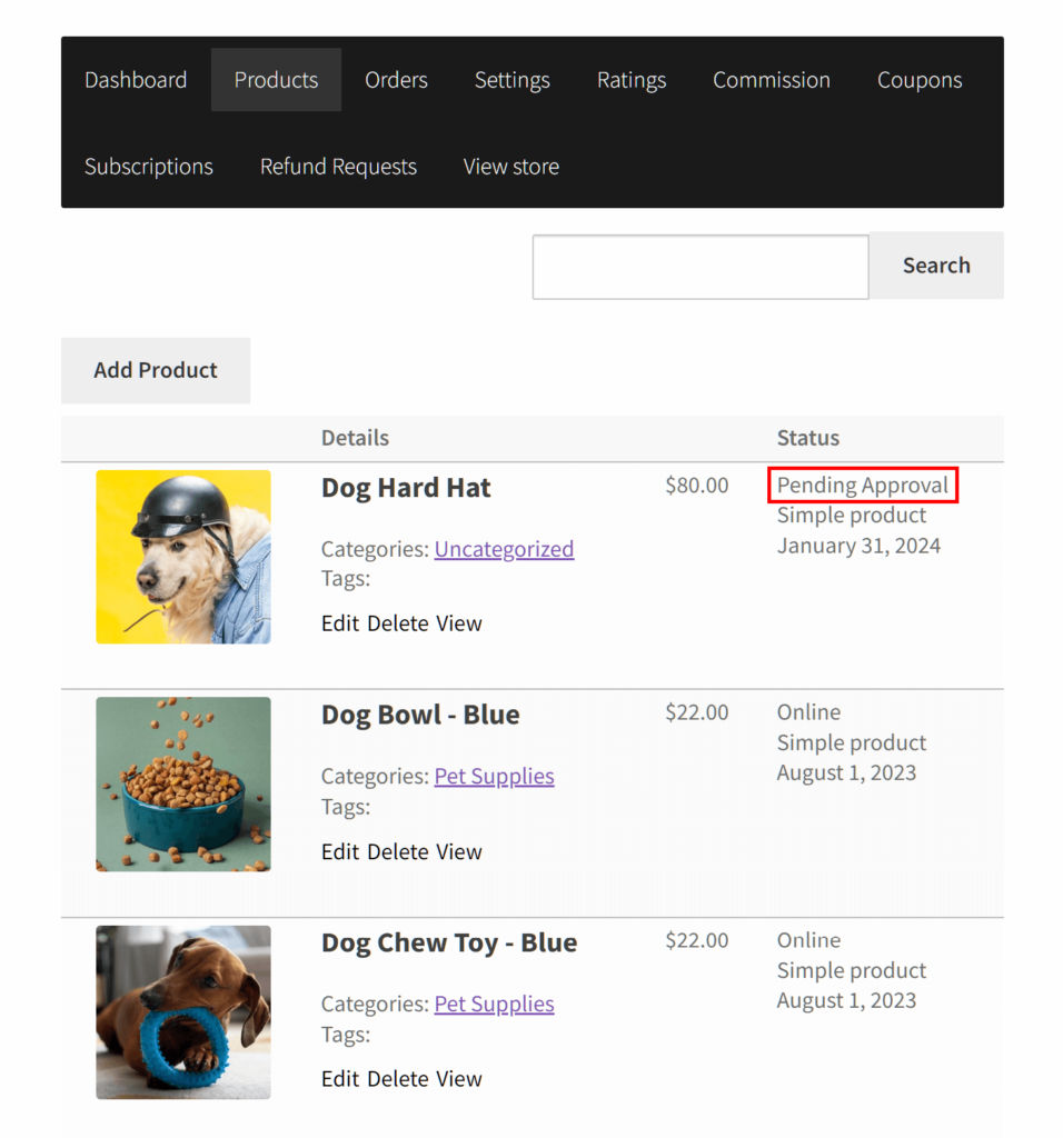 If the vendor examines their list of products, they’ll see that the newly submitted product has the “Pending Approval” status. In our example below, the pending product is “Dog Hard Hat.”