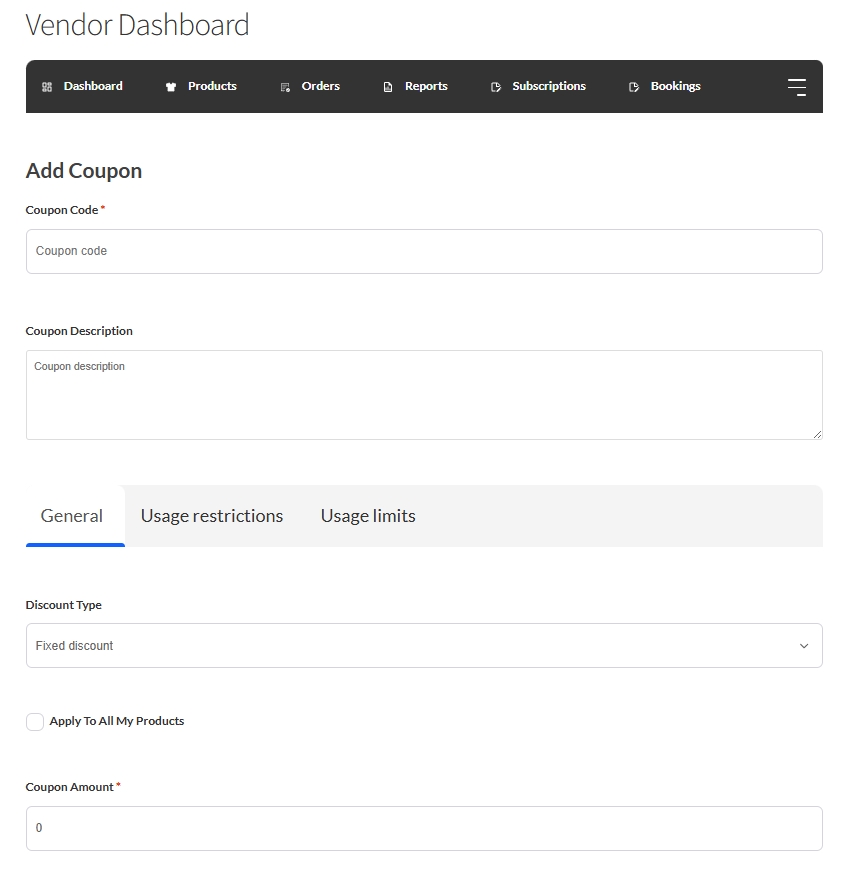 Vendors can set up their own coupons directly through the dashboard. Here’s how vendors can create a discount using WC Vendors: