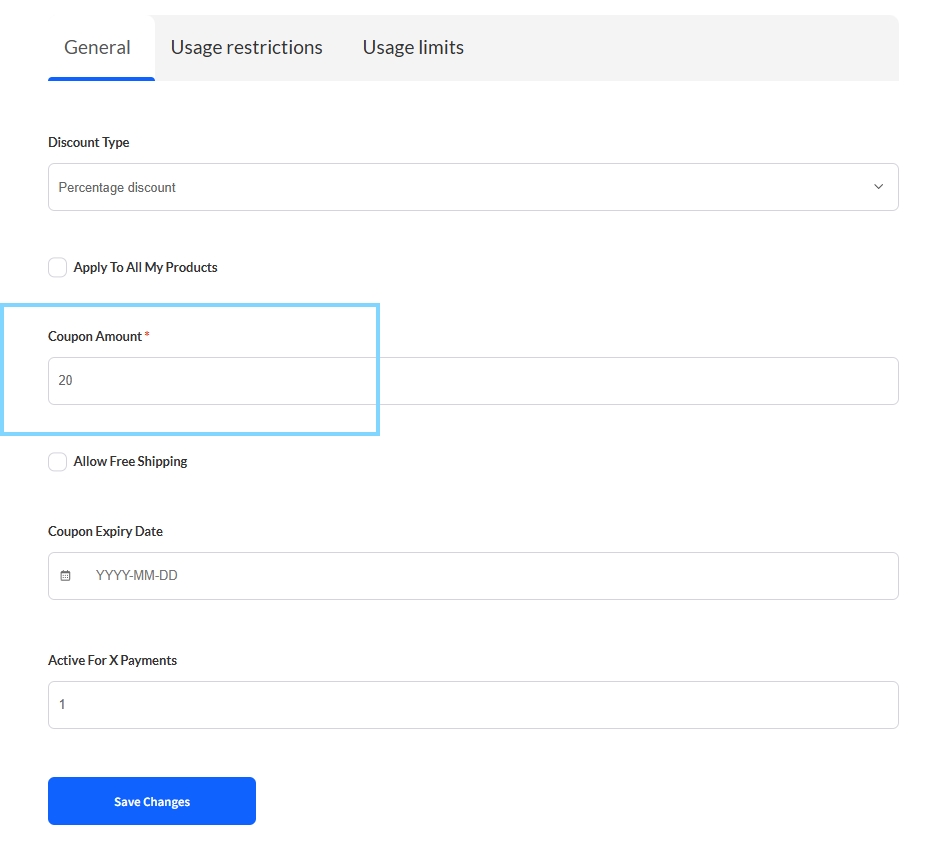 First, indicate your coupon code and coupon description. Next, under the General tab, pick the kind of discount you want to offer. For example, you may choose a percentage change or a fixed amount. Pick the type that fits your product and your goal for the offer.