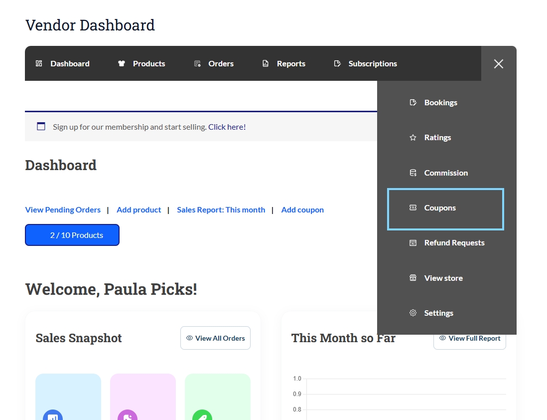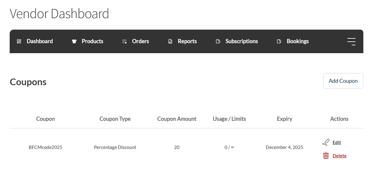 Start by logging in to your account. Open your vendor dashboard. This is your main workspace, where you handle your products, orders, and shop tools. On your dashboard menu, click the Coupons tab. This page shows all the coupon codes you have created. If this is your first time, the page will be empty, and that is normal.